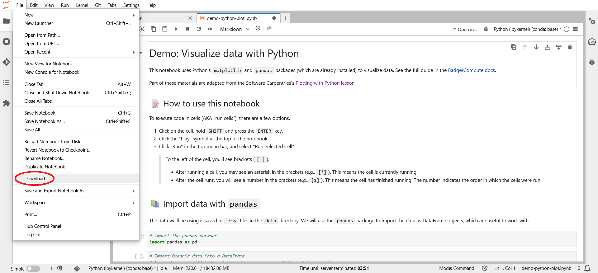 Option 2: When the file is open, go to the top menu bar and click "File" and select "Download".